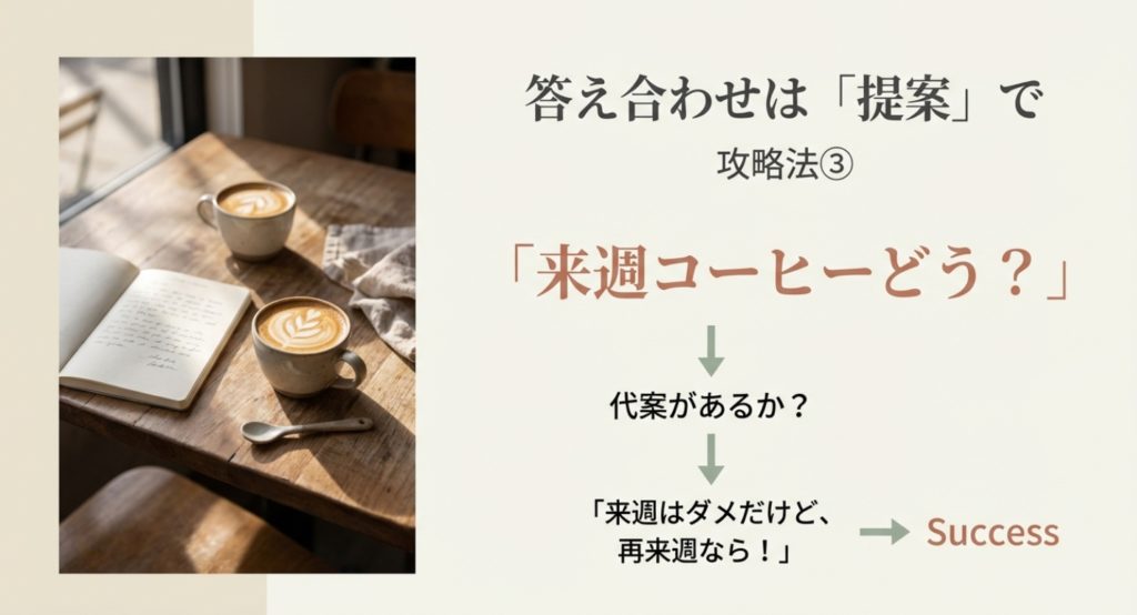 いきなり「デートしてください!」と重く迫るのではなく、「来週の週末、もし時間あったら美味しいコーヒー飲みに行かない?」と、具体的かつ軽めの提案をしてみてください。