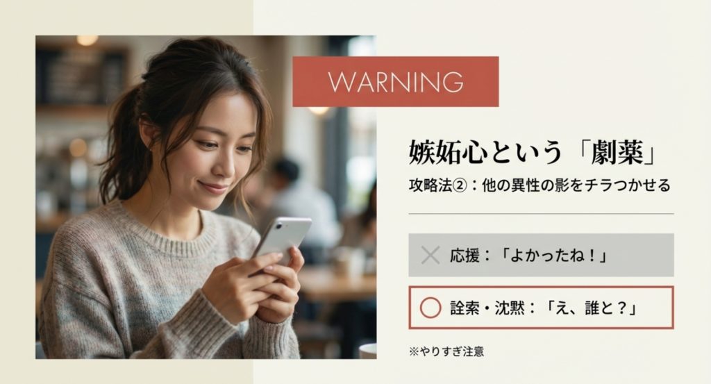 嫉妬作戦は劇薬です。頻繁にやりすぎると「男遊びが激しい子なのかな」と誤解されてしまうリスクがあります。ここぞという時に一度だけ試す程度に留めておきましょう。