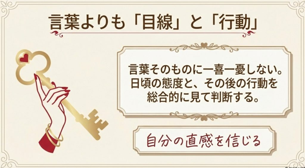 大切なのは、言葉そのものに一喜一憂するのではなく、「その言葉を発する時の相手の目線」や「日頃の態度」、そして「その後の行動」を総合的に見て判断することです。
