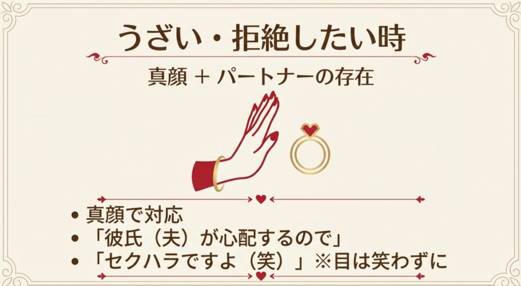 特に「パートナーの存在」を出すのは非常に強力な防御策です。