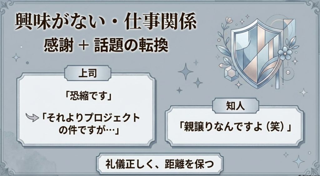 このように、「ありがとうございます」と一旦受け止めた上で、すぐに仕事の話や第三者の話題に切り替えることで、「これ以上プライベートな話をする気はありません」という意思表示を、角を立てずに伝えることができます。