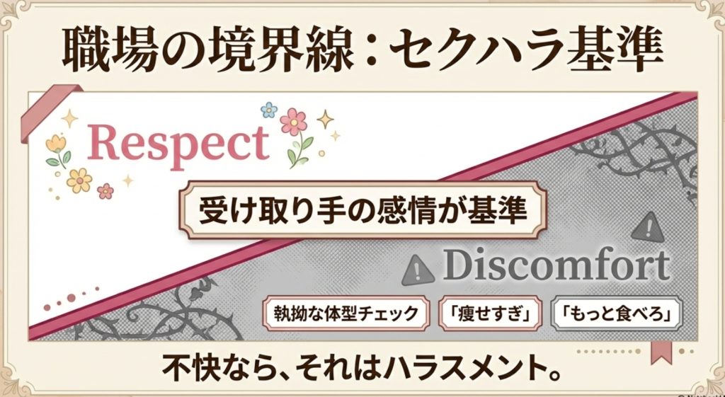 「痩せすぎじゃない?」「もっと食べたほうがいい」といった発言も、場合によっては余計なお世話であり、セクハラの一種と捉えられることもあります。