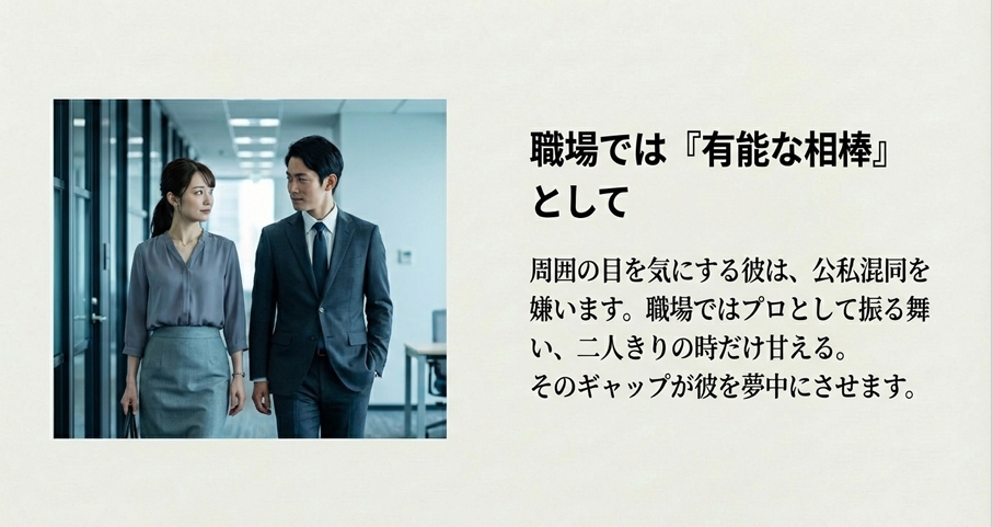二人きりになった瞬間だけ、少しだけ柔らかい表情を見せる。その「二人だけの秘密の共有」が、彼の中でのあなたの存在をより特別なものに変えていきます。