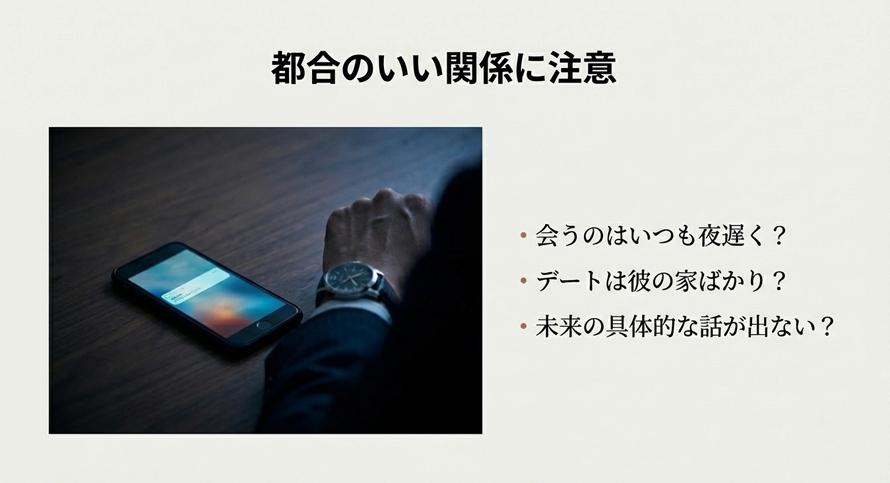 - 会うのがいつも夜遅くだったり、彼の家ばかりではないか