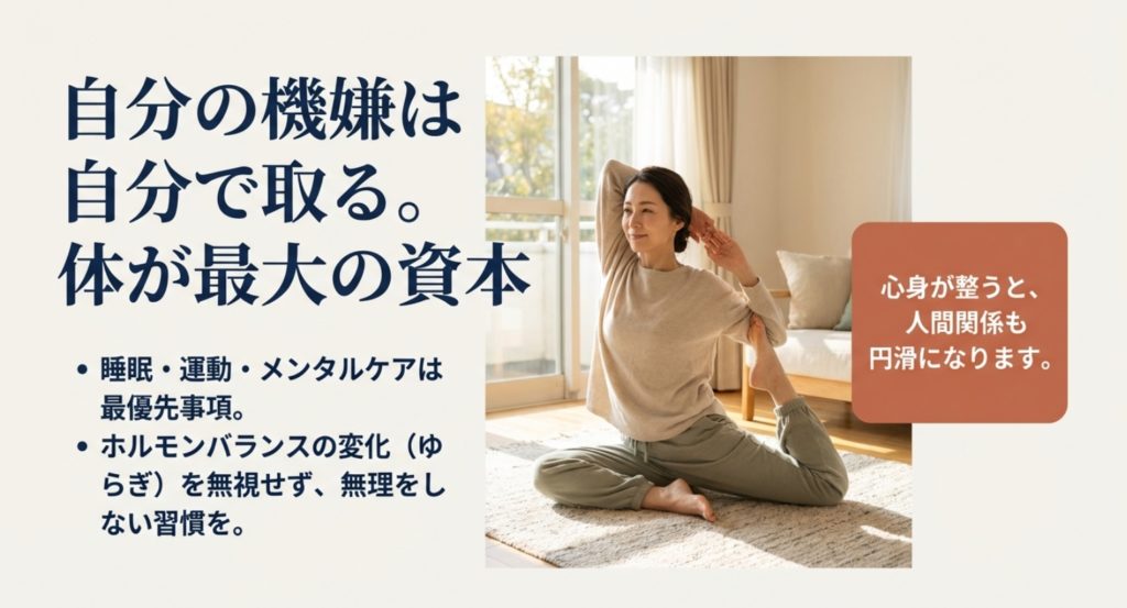 40代はホルモンバランスの変化など、体調に波が出やすい時期ですよね。成功している女性は、この変化を無視せず、「無理をしないこと」を習慣にしています。